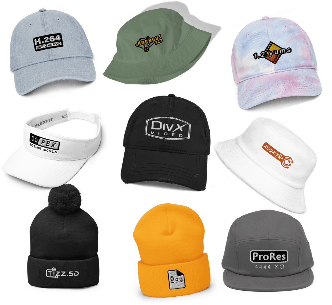 the VIDEO CODEC HATS are here! They come in all the popular flavors like H.264, ProRes 4444 XQ, and Horngut. Each embroidered video codec logo is paired with a style and material that matches its unique personality. For example the Divx hat is a black baseball cap with fake distressed rips all over it.